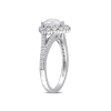 This heart-cut moissanite halo split shank engagement ring is crafted in lustrous sterling silver. This elegant wedding ring features a heart-cut, prong-set created white moissanite gemstone at the center with 42 round-cut, prong-set created moissanite gemstones arranged in a halo and along the split shank band. Enhanced with a high polish finish, this fancy-cut bridal ring portrays a feminine and