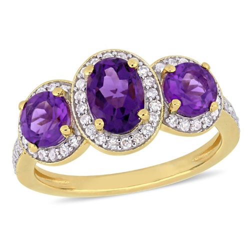 This ring is crafted in yellow plated sterling silver and features cushion and round-cut Amethyst stones at its center 1.60 carats (ctw) surrounded by a total of 56 round-cut, prong-set diamonds (.28 carats H-I, I2-I3) inn a unique split shank three-stone halo design. Instantly add a touch of color and style with this stunning accessory.