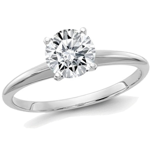 Crisp 14 karat white gold is set with a 1.75 carat (2.00 Carat diamond look) 8.0mm synthetic moissanite gemstone. Moissanite is a gemstone with extraordinary durability and brilliance. Moisannite is the perfect replacement for a diamond and comparable to or even surpassing the clarity, and color of a diamond. This ring includes a True Light moissanite round cut stone with an equivalent diamond co