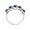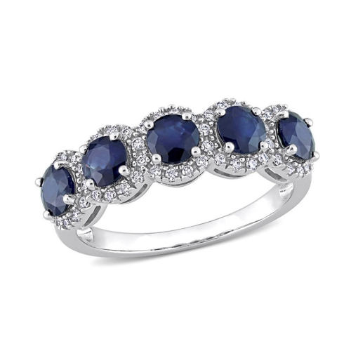 This sapphire and diamond five stone semi-eternity band ring is crafted in lustrous 14-karat white gold and features five round-cut, prong set blue sapphires paired with 52 round cut, buttercup set diamonds in a unique halo anniversary ring design. With exquisite luster and a brilliant shine, this gemstone and diamond anniversary band is sure to make a standout addition to any jewelry collection.