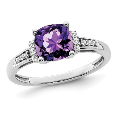 A stunning cushion cut 7mm purple amethyst sits in rich rhodium plated polished 14 karat white gold in this simple and elegant ring featuring the birthstone of February with tiny accent diamonds completing the look. Twelve additional sparkling round diamonds (0.09 carats (ctw) support the purple gem and complete the look of this elegant ring.