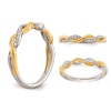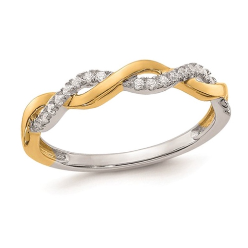 This twist criss-cross band diamond wedding ring is crafted from gleaming polished 14 karat white and yellow gold as sparkling diamonds 1/8 carats (ctw) completes the look.