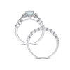 Add a bit of glam to your look with this classic aquamarine and white topaz with diamond accent vintage bridal wedding set. Crafted in lustrous 10 karat white gold it features one round-cut, prong-set aquamarine gemstone (6.5 x 6.5mm) studded at the center with a halo of 20 round-cut, prong-set white topaz gemstones. The matching wedding bit features 12 round-cut pave-set diamonds (G-H, I2-I3). Bu