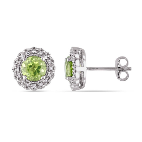 Get a vintage look for a high profile party with these classic peridot and accent diamond halo solitaire stud earrings. Crafted in polished sleek sterling silver, these queenly earrings feature two round cut, prong-set peridot gemstones (6x6mm) and 32 round cut, pave-set diamonds (H-I,I2-I3) with milgrain detail. Polished to brilliance, these splendid solitaire earrings are secured with butterfly