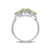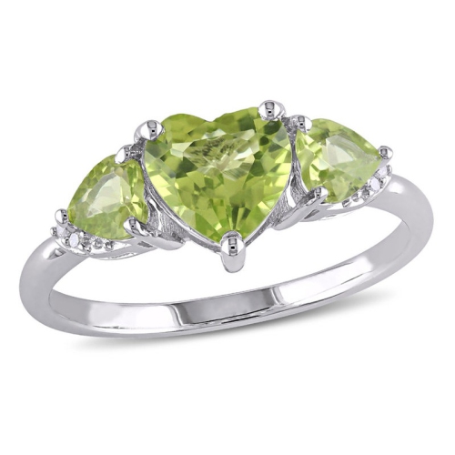 Celebrate her graduation day with this feminine Peridot and Diamond Accent 3-Stone Ring.Crafted in sparkling sterling silver, this classic ring showcases three heart cut, prong set peridot gemstones (7 x7mm) with six round cut pave set diamonds (G H, I2-I3).Enhanced with a high polish finish, this mesmerizing 3-stone ring will bring her prosperity. Green preidot is the featured birthstone of Augus
