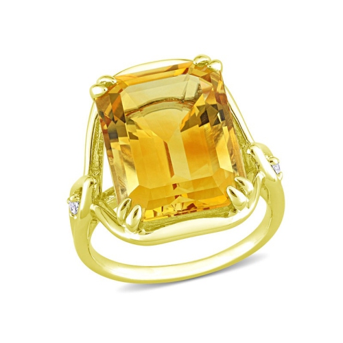 This captivating solitaire ring is crafted in lustrous yellow plated silver and features an octagon-cut, prong-set citrine (16x12mm) adorned with round-cut, two prong-set white topaz (1.8x1.8mm) gemstones. Enhanced with a polished finish, this remarkable ring adds a pop of class to every outfit. Citrine is the featured birthstone of the month of November.