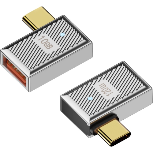 10Gbps USB C to USB3.1 90° Angle OTG Adapter 120W Type C Male to USB3.1 Female Right Angle Charger Data Connector, Zn Alloy/LED Light, for Phone Laptop Tablet, Silvery/Side Bend, 2