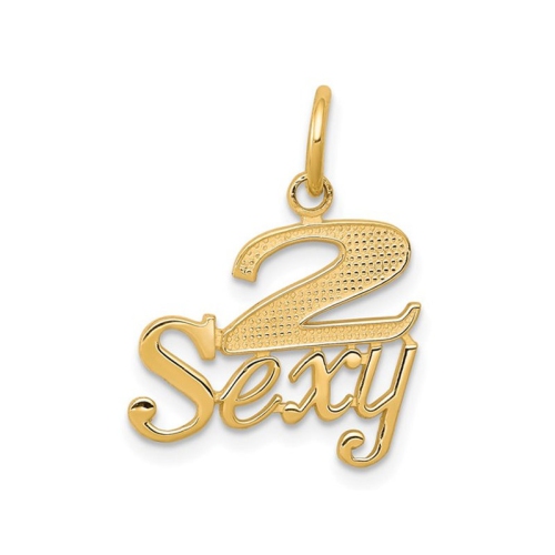 A beautiful 10 karat yellow gold charm pendant featuring the words - 2 SEXY -. This item does not include a chain only the pendant. The pendant weighs 0.70 grams and is 4/5 inches in width. This cute gold charm does not include a chain only the pendant.