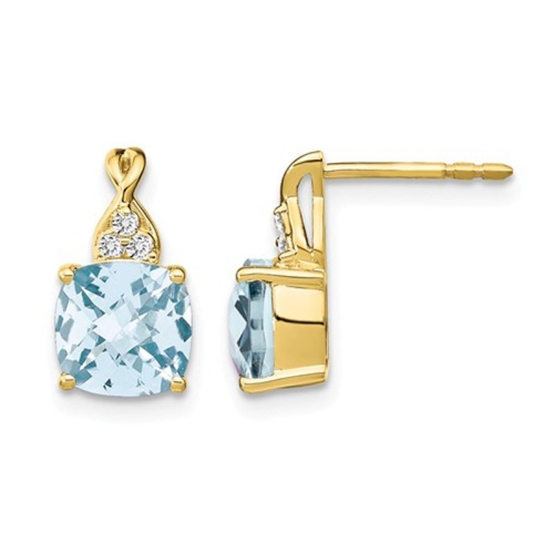 Beautiful cushion cut aquamarine gemstones 3.35 carata (ctw) the birthstone for March are set in shimmering polished 14 karat yellow gold in these gemstone post earrings. Sparkling accent diamonds complete the look.