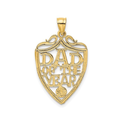 Show him you love him with this DAD OF THE YEAR pendant charm he can be proud to wear. Crafted from polished 10 karat yellow gold with plaque shield motif. This pendant is 1 inches in length and 1/3 inch in width and weighs 1.26 grams. This pendant does not include a chain.