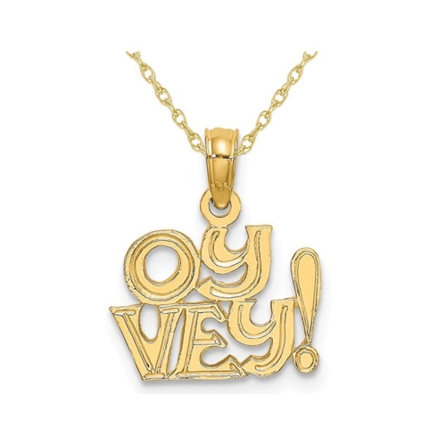 Bring our your inner kvetcher with this unique yiddish OY VEY pendant necklace crafted from 10 karat yellow gold with matching 18 inch chain. This pendant is approximately a 1/2 in length and 1/2 inch in width and weighs 0.60 grams.