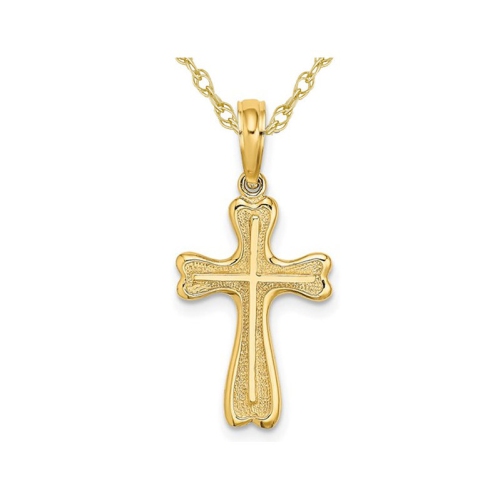 Celebrate your faith with this timeless edge passion cross pendant. Beautifully crafted in textured 10 karat yellow gold, this pendant will make a lovely piece for everyday or to adorn a special occasion. This pendant includes an 18 Inch gold chain. This cross is 3/4 inch in length and 3/4 inch in width and weighs approximately 0.90 grams.