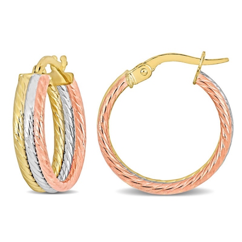 10K Yellow, White and Rose Gold Triple Row Twisted Hoop Earrings