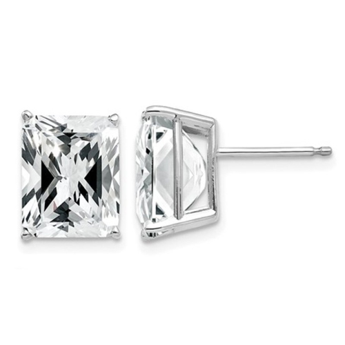 This timeless pair of earrings is crafted in 14 karat white gold and is illuminated by the sparkle of 10x8mm emerald-cut white cubic zirconias. A great way to achieve elegance at an affordable price, this pair of solitaire earrings will make a splendid addition to any jewelry collection.