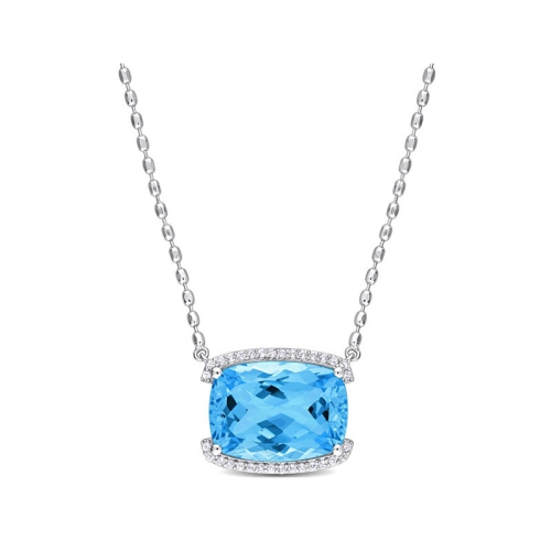 This stunning pendant features a large sideways set 13 carat (ctw) cushion cut sky blue topaz center stone surrounded by a halo of sparkling white topaz gemstones. The pendant is crafted from polished sterling silver and comes with a matching chain that measures 18 inches in length. Blue topaz is the birthstone for the month of December.