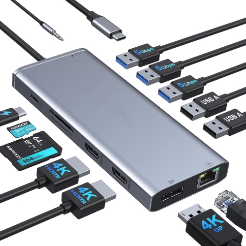 13 in 1 USB C Hub with Multiport Adapter Dongle with 2 HDMI, DP, Ethernet, PD Charging, 3 USB 3.0, 2 USB 2.0, SD/TF, Mic/Audio for Dell/HP/Lenovo/Surface, Grey