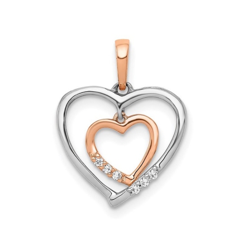 14 karat white gold is crafted into a polished heart charm with a smaller rose gold heart within the pendant. This gold pendant weighs 0.75 grams and is 1/2 inch in width and 1/2 inch in length. This heart charm does not include a chain only the pendant. (NO CHAIN). Six tiny sparkling accent diamonds complete the look.