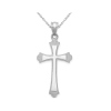 This simple cross shaped pendant design lets the inherent brilliance of 14 karat white gold shimmer and shine. A traditional design, this piece includes polished and milgrain finished white gold. This symbolic pendant comes with an 18-inch 14 karat white gold chain for easy adornment.