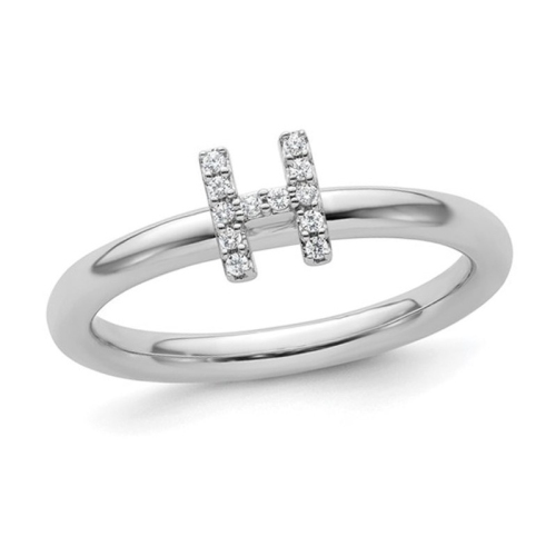 A simple and elegant ring crafted from crisp 14 white gold with the initial - H - across the top as the main feature. This initial ring has tiny sparkling accent diamonds at its center for a little extra glitter, total diamond weight 0.06 carats (ctw).