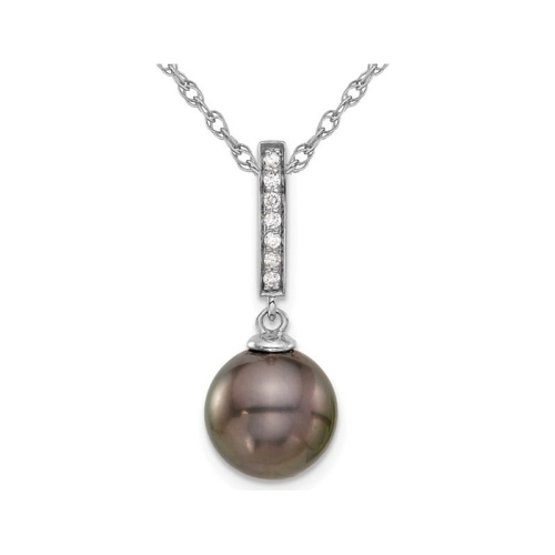 A single black Tahitian Cultured saltwater pearl (10-11mm) , sits in the embrace of crisp 14 karat white gold with a matching 18 inch gold chain included. Pearl is the birthstone for June. Above the bold black pearl sits 8 sparkling accent diamonds completing the look of this beautiful pendant.