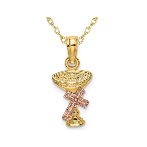 14K Yellow and Rose Gold Communion Cup with Cross Charm Pendant Necklace with Chain