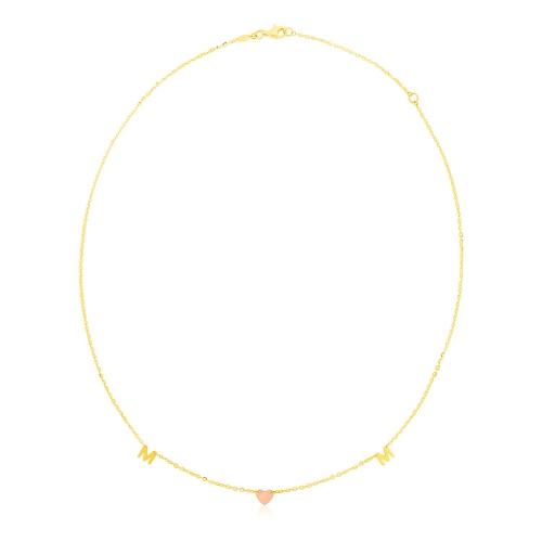 A sweet heart of rose gold contrasts beautifully with yellow 14k two tone gold in this heartfelt "Mom" necklace. Necklace is 18 inches long and closes with a lobster clasp. Product Specifications: Clasp Lobster Clasp Approximate Weight : 2 gram(s) Metal 14K Two-Tone Gold Metal Type : White-and-yellow-gold Product Item Type : chain-necklaces