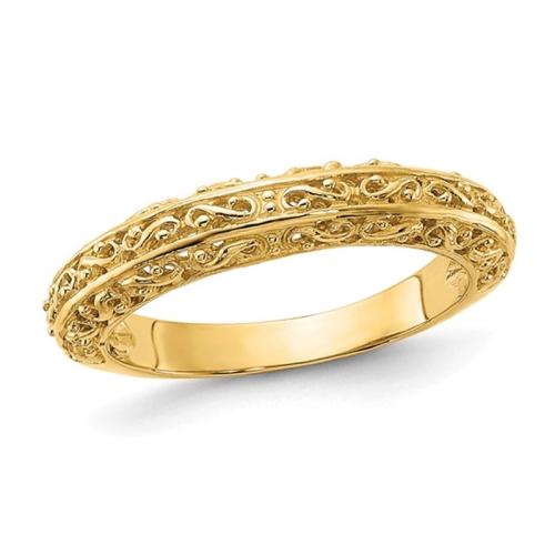 A perfect band for ladies, with this shimmering 14 karat yellow gold polished filigree designed band that combines pure classiness with pure love. Feel great making this choice. This gold wedding band 2.70 grams.