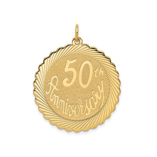 14 karat yellow gold is crafted into a polished and etched circle pendant charm. The front of the polished pendant features th words - 50th Anniversary - at the center of this charm adding extra style. This pendant is approximately 1 1/2 inches in length and 1 1/5 inch wide and weighs 3.66 grams. This pendant does not include a chain it sold seperately.