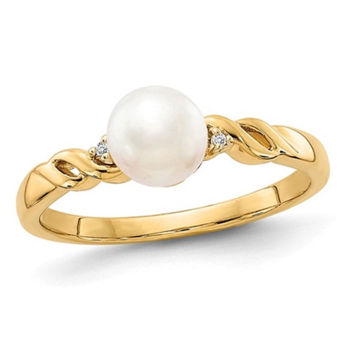 14K Yellow Gold 6mm Freshwater Cultured White Pearl Ring with Accent Diamonds
