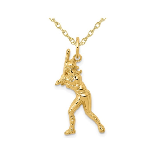 Take me out to the ball game , with this perfect pendant for the baseball lover in your life, this female baseball player pendant is crafted in polished 14 karat yellow gold. The look is completed with a matching 18 inch yellow gold chain, completing a sporty accessory that is fitting for both men and women. Each sports inspired charm weighs 1.18 grams and is 1 inch in height and 2/5 inches in wid