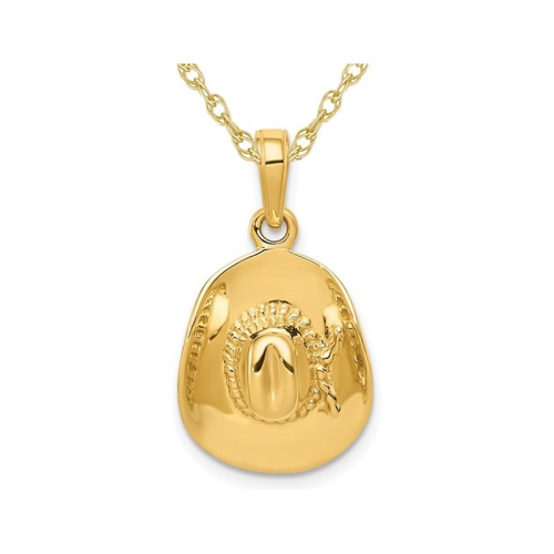 Giddyup! Crafted in sleek polished 14 karat yellow gold and including an 18 inch gold chain this cowboy hat charm pendant is perfect for all the cowgirls and cowboys out there. This cute charm is 1/2 inch wide and weighs 2.55 grams.