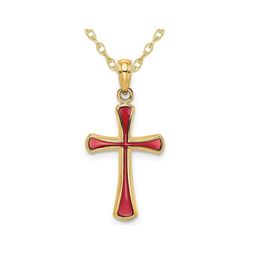 Celebrate your faith with this timeless cross pendant. Beautifully crafted in polished casted 14 karat yellow gold with striking pink enamel, this pendant will make a lovely piece for everyday or to adorn special occasion. This pendant includes an 18 Inch chain. This cross is 4/5 inches inch in length and 1/2 inch in width and weighs approximately 0.800 grams.