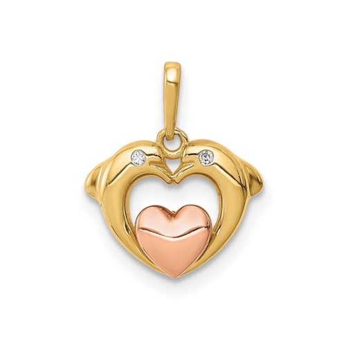 Beautiful 14 karar yellow gold creates a double dolphin charm pendant into a pink gold heart motif inspired by the sea in a unique style with synthetic cubic zirconias as the dolphin eyes. This cute pendant weighs 0.74 grams and is 2/5 inch in length and 2/5 inches in width. NO CHAIN is included with this pendant.
