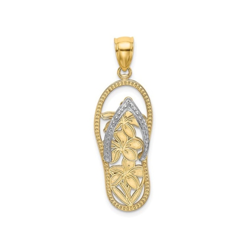 Chic and glamourous, this 14 karat yellow gold with whit gold highlight flip-flop sandal charm pendant features a unique summery beach floral design. This unique pendant weighs 1.88 grams and is 1/2 inches wide and 1 1/2 inch in length. This flip flop charm flower design does not include a chain only the pendant.