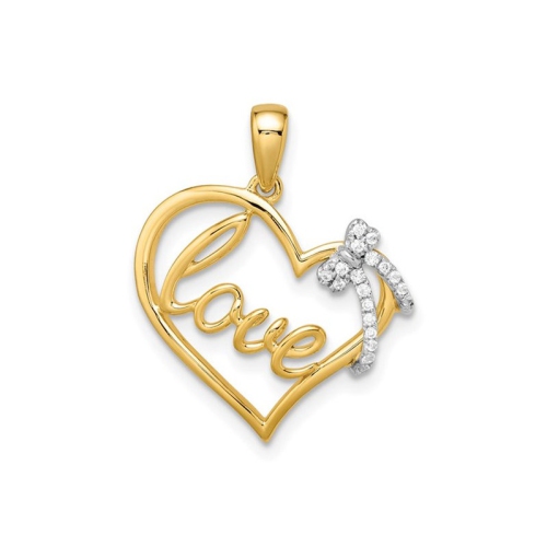 14 karat yellow gold is crafted into a polished open heart charm with the word LOVE in the center. A beautiful ribbon bow completes the look with 19 tiny accent diamonds. This gold pendant weighs 1.70 grams and is 3/4 inch in width and 3/4 inch in length. This heart charm does not include a chain only the pendant. (NO CHAIN).