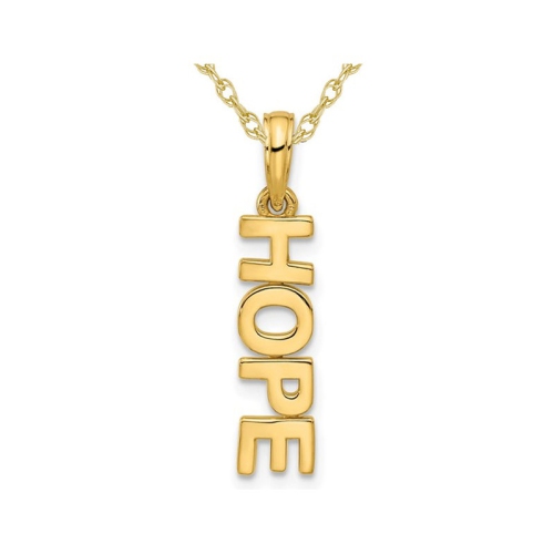 Wear your positive outlook and inspire with this simple 14 karat yellow gold HOPE pendant and matching 18 inch gold chain included. The verbal charm weighs 1.20 grams and 4/5 inches high.