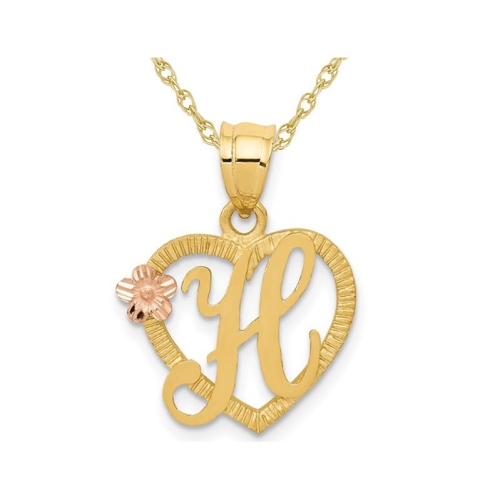 A stylish and meaningful gift for yourself or someone you love, this letter initial - H - pendant is fashioned in polished 14 karat yellow gold with a pink gold flower. The look is complete with a matching 18 inch gold chain, for an elegant accessory you'll love sporting at every opportunity. This classic fancy design is 2/3 inches in length and 2/3 inches wide and weighs 1.19 grams. This pendant