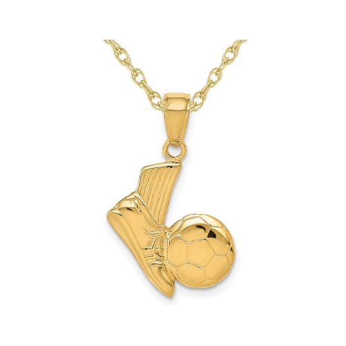 Be a soccer superstar and kick it into high gear with this 14 karat yellow gold polished kicking soccer ball charm pendant and matching 18 inch gold chain included. This leg kicking charm weighs 1.55 grams is 2/3 inch in width and length.