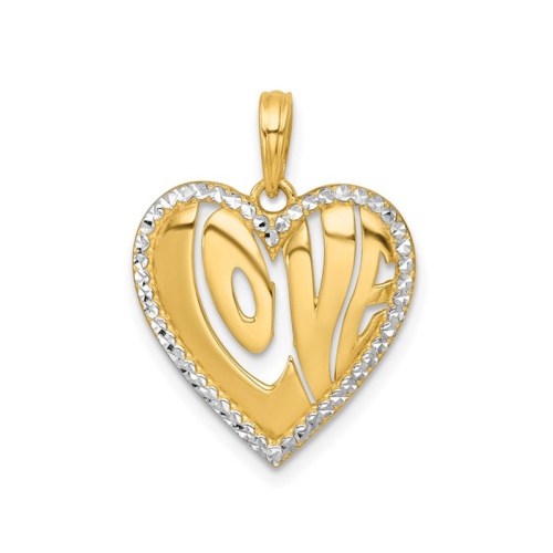 14 karat yellow gold is crafted into a polished classic open heart Pendant while the word - Love - sits at the center in a yellow gold finish of this heart charm. This pendant is approximately 3/4 inches in length and 3/4 inch wide and weighs 1.70 grams.