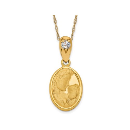 Beautifully crafted polished 14 kara yellow gold is molded into a mother and child oval charm pendant that includes an 18 inch gold chain. A tiny clearlight aquamarine gemstone sits above the pendant adding a little extra color. This elegant keep sake weighs 2.45 grams and is 1 inch in length.
