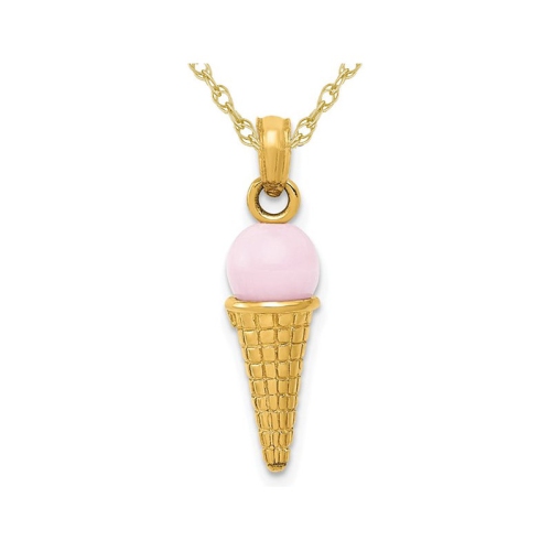 Cool off with this tasty pink quartz ice cream cone charm crafted from gleaming 14 karat yellow gold that includes a matching 18 inch yellow gold chain. A really cute charm pendant. This pendant weighs 1.48 grams.