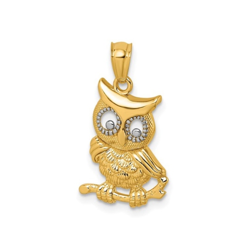 A delightful pendant in the shape of a wise owl crafted from 14 karat polished and textured yellow gold. This animal inspired pendant is 3/4 inch in length and 1/2 inch in width and weighs 0.95 grams. This pendant does not include a chain.