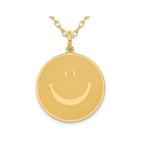 Shimmering polished 14 karat yellow gold is crafted into a stunning into a simple solid gold smiley face. This beautiful charm pendant includes a matching 18 inch yellow gold chain and is approximately 3/4 inch wide and 3/4 inch in height and weighs 1.05 grams.