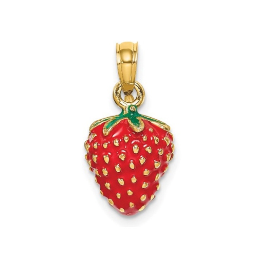 A delightful red enameled strawberry charm crafted in polished 14 karat yellow gold hangs. This cute fruity pendant weighs 3.14 grams and 1/2 inch in length and 2/5 inches wide. NO chain is included with this pendant.