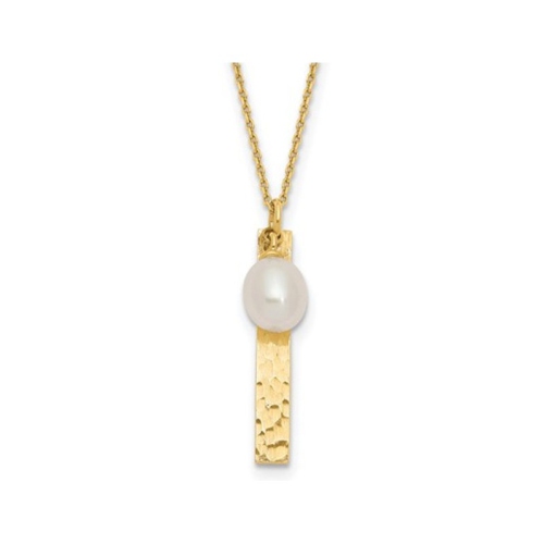 A simple and elegant design of a freshwater cultured pearl in brushed 14 karat yellow gold with a matching 17 inch gold chain included.