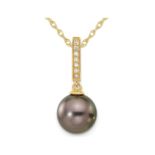 A single black Tahitian Cultured saltwater pearl (10-11mm) , sits in the embrace of shimmering 14 karat yellow gold with a matching 18 inch gold chain included. Pearl is the birthstone for June. Above the bold black pearl sits 7 sparkling accent diamonds (0.07 carats (ctw)) completing the look of this beautiful pendant.
