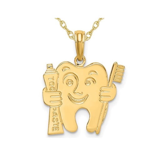 This cute unique dental charm pendant is crafted from 14 karat yellow gold. This unique pendant featuring a smiling too holding a toothbrush and toothpaste includes an 18 inch 14 karat yellow gold chain. This pendant weighs 1.35 grams and i2.3 inch in length and 1/2 inch in width.