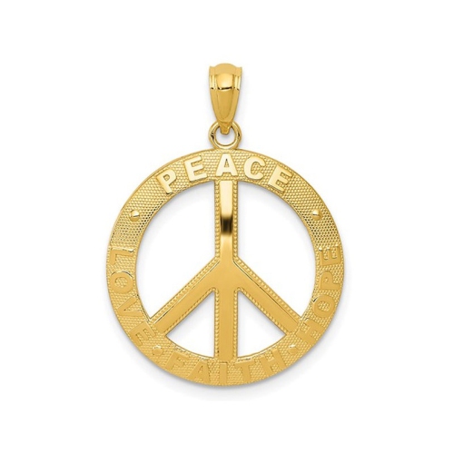 Playful and unique, this peace sign pendant with the words PEACE , LOVE, FAITH, HOPE down the center is crafted in textured 14 karat yellow gold. Perfect for adding a funky touch to your everyday wear, this pendant will make a lovely addition to any jewelry collection! This peace charm pendant is 4/5 inch in width and length and weighs 2.09 grams. This special peace charm pendant does NOT include