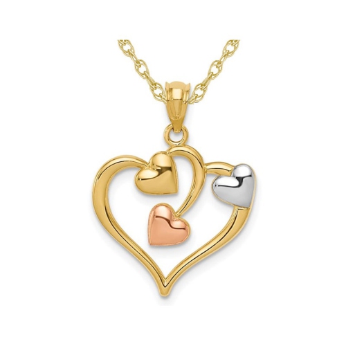 14 karat yellow gold is crafted into a polished multi-heart Pendant with 3 hearts smaller hearts as an 18 inch yellow gold chain is included with this gold necklace. This yellow gold pendant with rose pink and white gold hearts is approximately 4/5 inches in length and 3/4 inch wide and weighs 0.98 grams.