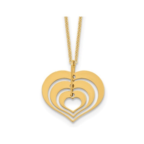 14 karat yellow gold is crafted into a polished multi-heart Pendant with 3 hearts smaller than the other as an 16 inch yellow gold chain is included with this gold necklace. This pendant is approximately 2/3 inches in length and 2/3 inch wide and weighs 1.95 grams.